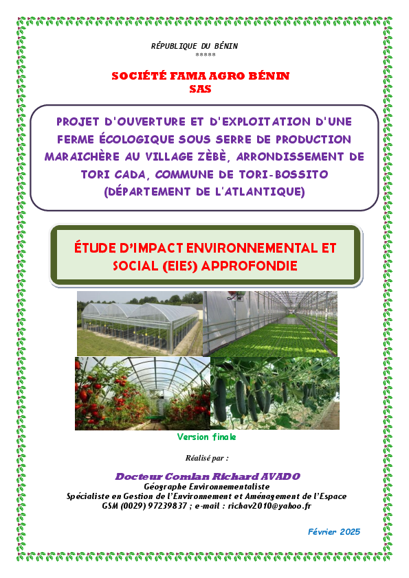Projet d'ouverture et d'exploitation d'une ferme écologique de production maraichère sous serre au...