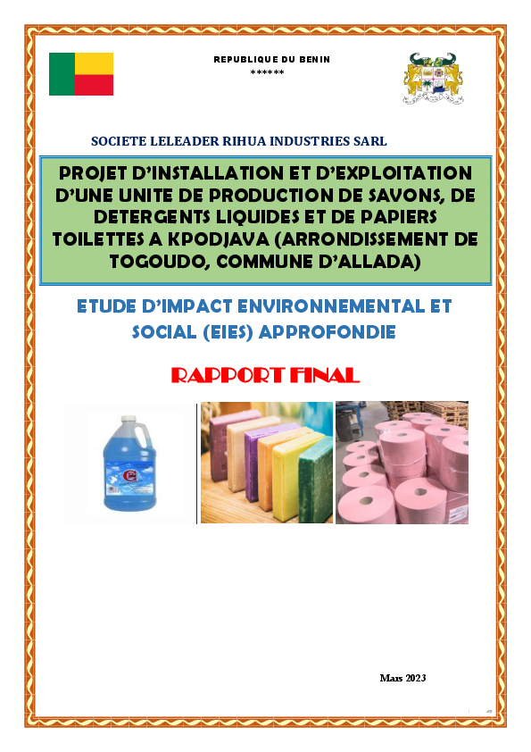 Rapport EIES : Installation et exploitation unité production savons, détergents liquides, papiers ...