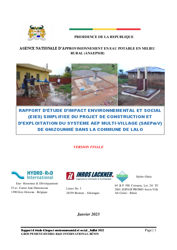 Projet Construction et Exploitation SAEPmV GNIZOUNMÈ, Commune LALO