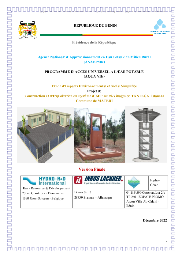 L’étude s’inscrit dans le cadre du Programme d’accès universel à l’eau potable AQUA VIE et concerne l’Alimentation en eau Potable de la Commune de MATERI et plus précisément l’arrondissement de Tantéga. L’alimentation en eau potable de cet arrondissement passe par la construction d’un Système d’Approvisionnement en Eau Potable multi Villages (SAEPmV) constitué :