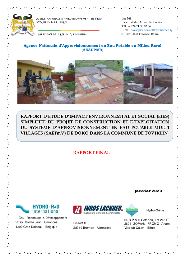 Construction et exploitation du système d'approvisionnement en eau potable multi-villages (SAEPmV) de Doko, Commune de Toviklin.