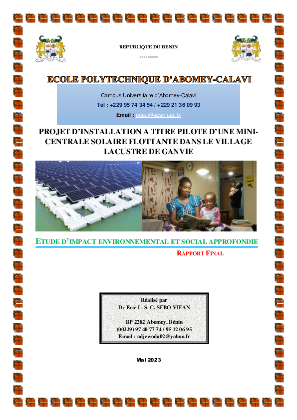 Pour ce faire, toute initiative porteuse de projets énergétiques qui cadrent bien avec la stratégie de développement du secteur, est favorablement accueillie par le Gouvernement, notamment les projets de développement des énergies renouvelables comme solutions alternatives aux énergies fossiles, destructrices de l’environnement. C’est dans ce cadre que s’inscrit le projet intitulé «Installation à titre pilote d’une mini-centrale solaire flottante dans le village lacustre de Ganvié» : Phase pilote porté par le Laboratoire d’Energétique et de Mécanique Appliquée (LEMA) de l’Ecole Polytechnique d’Abomey-Calavi (EPAC).