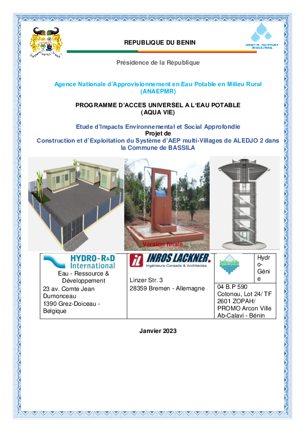 De façon spécifique, il envisage (i) la Construction des systèmes d’approvisionnement en eau; (ii) la Réhabilitation et l’expansion des systèmes d’approvisionnement en eau existants et (iii) la Mise en place de modèles de gestion professionnalisée des AEV. Ainsi dans la Commune de BASSILA et précisement dans l’arrondissement d’Alédjo, il est prévu de la construction et l’exploitation d’un SAEP multi-Villages. Le programme AQUA VIE étant un programme étant un financement PforR c’est à dire Programme pour les Résultats, il est assujetti aux exigences environnementales et sociales du pays emprunteur.