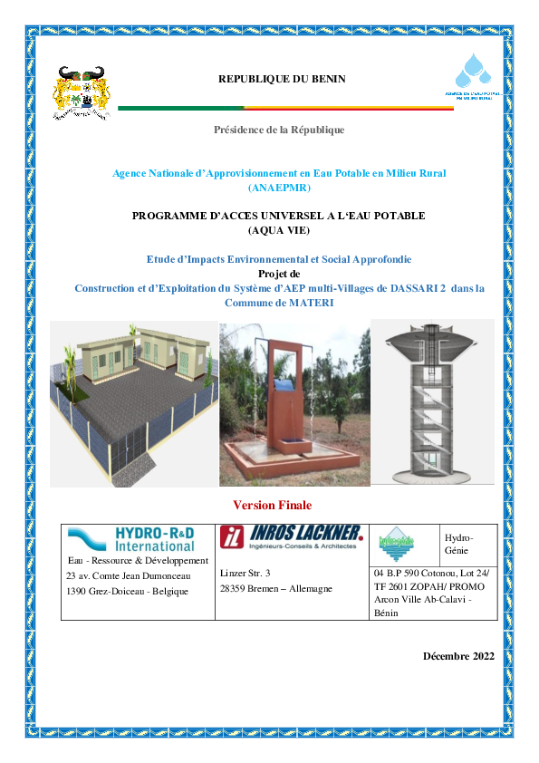 Le Programme AQUA-VIE a pour objectif général d‘accroitre l’accès aux services d’eau potable en milieu rural à travers le développement de systèmes d’eau potable et la mise en place de modèles de gestion professionnalisée. De façon spécifique, il envisage (i) la Construction des systèmes d’approvisionnement en eau; (ii) la Réhabilitation et l’expansion des systèmes d’approvisionnement en eau existants et (iii) la Mise en place de modèles de gestion professionnalisée des AEV. Ainsi dans la Commune de MATERI et précisement dans l’arrondissement de Dassari, il est prévu de la construction et l’exploitation d’un SAEP multi-Villages. Le programme AQUA VIE étant un programme étant un financement PforR c’est à dire Programme pour les Résultats, il est assujetti aux exigences environnementales et sociales du pays emprunteur.