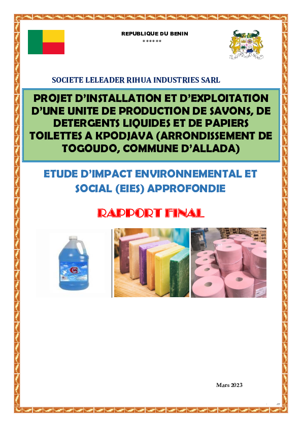 Rapport EIES : Installation et exploitation unité production savons, détergents liquides, papiers toilettes à Kpodjava (Togoudo, Allada)