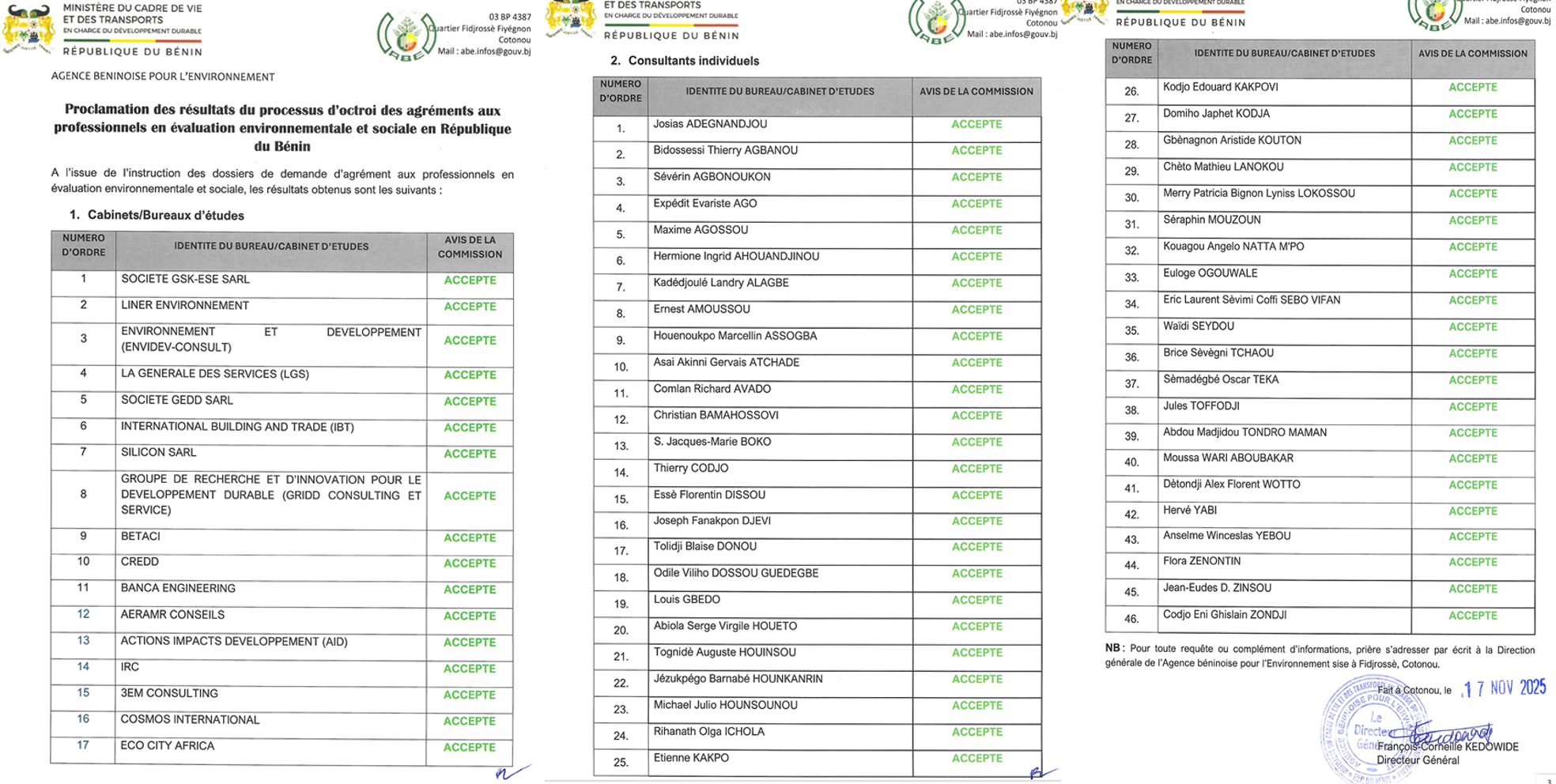 Proclamation des résultats du processus d'octroi des agréments aux Professionnels en évaluation environnementale et sociale en RB