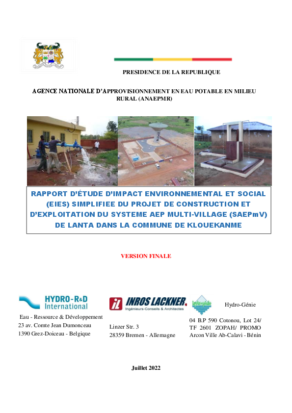 Projet Construction et Exploitation SAEPmV LANTA, Commune KLOUEKANME
