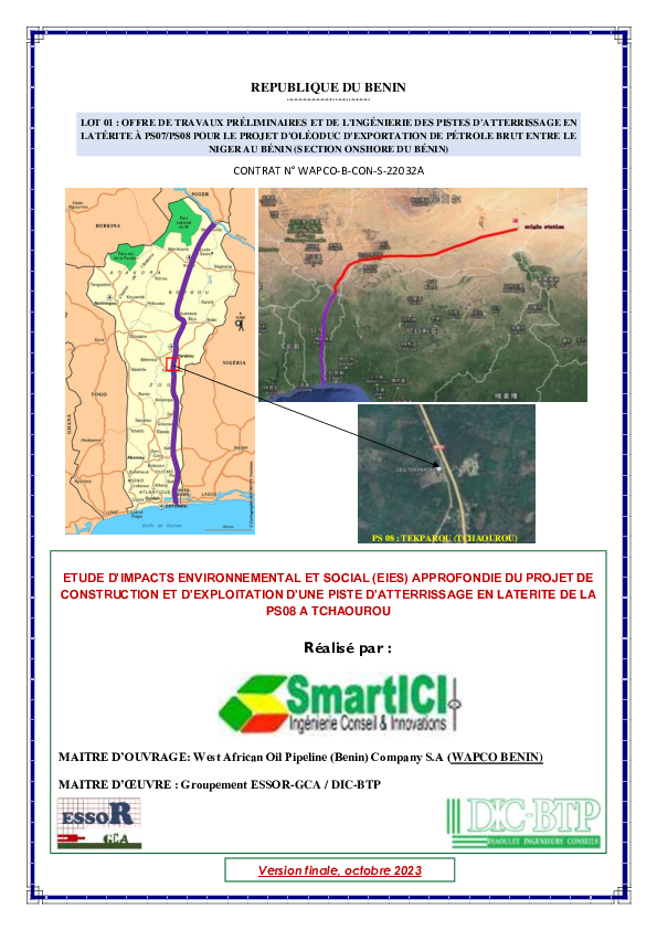Le Projet de construction et d’exploitation d’une piste d’atterrissage en latérite (LAT) pour accueillir les avions de type Twin Otter Series 400 dans le village Tékparou, Arrondissement de Tchatchou Commune de Tchaourou (département de Borgou) est une initiative de la société West African Oil Pipeline (Benin) Company S.A (WAPCO BÉNIN) qui vise à faciliter à gérer les situations d’urgence au cours de la phase d’exploitation du projet d’oléoduc d’exportation de pétrole brut Niger-Bénin (NBEP).