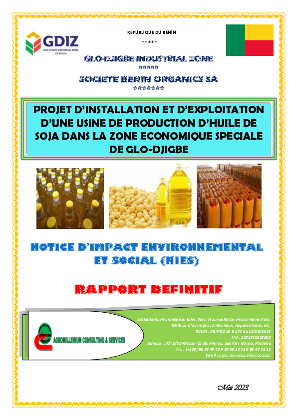 INSTALLATION ET EXPLOITATION D’UNE USINE DE PRODUCTION D’HUILE DE SOJA DANS LA ZONE ECONOMIQUE SPECIALE DE GLO-DJIGBE