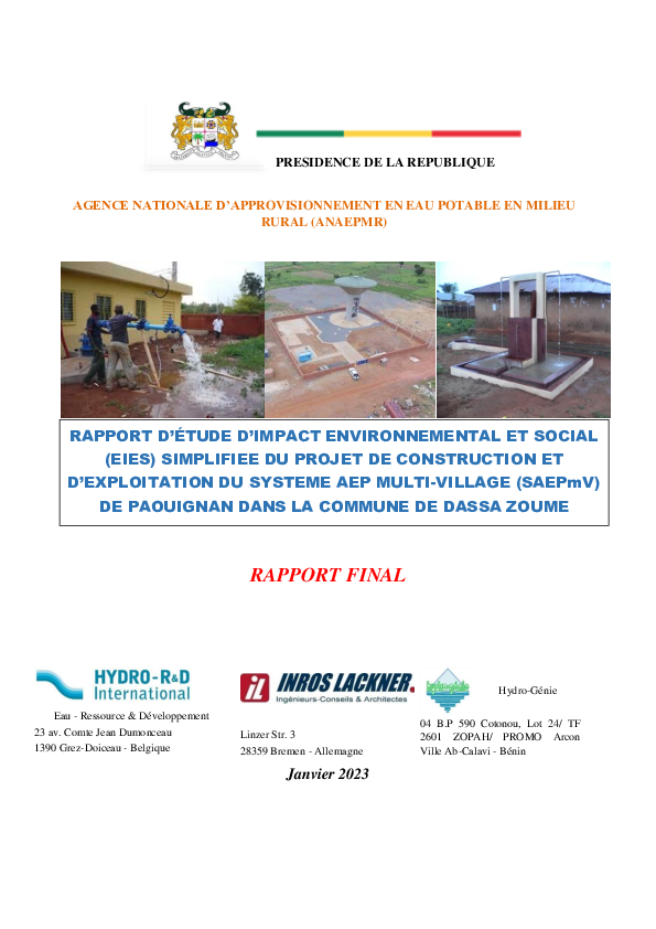 Le présent rapport rend donc compte de l’étude d’impact environnementale et sociale simplifiée du projet de construction du SAEPmV dans l’arrondissement de Paouignan dans la commune de Dassa-Zoumè Il vient aussi répondre aux exigences des Termes de Référence, aux recommandations du promoteur et au guide général d’EIES édité par l’Agence Béninoise pour l’Environnement (ABE).