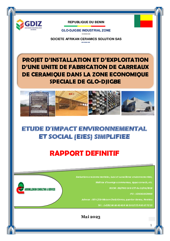 Projet d’installation et d’exploitation d’une unité de fabrication de carreaux de céramique dans la zone économique spéciale de Glo-djigbé