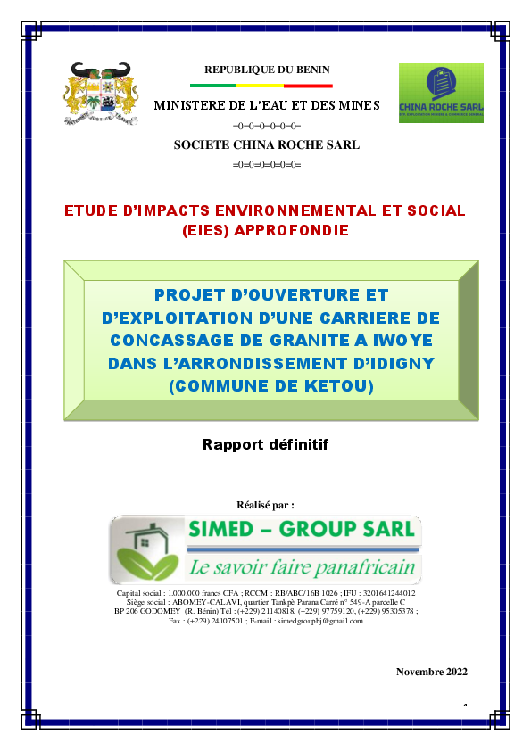 Rapport EIES : Projet d'exploitation de carrière de concassage de granite à Iwoye, arrondissement d'Idigny, commune de Kétou.